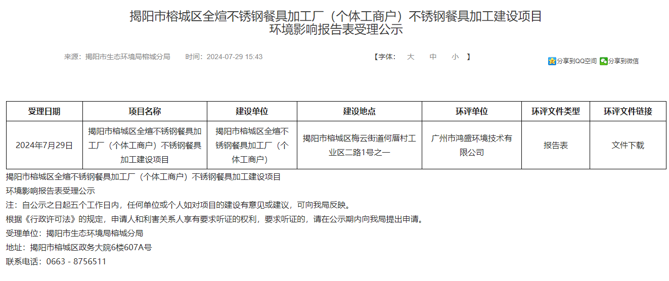 7月30日,揭陽市生態(tài)環(huán)境局榕城分局受理揭陽市榕城區(qū)全煊不銹鋼餐具加工廠(個體工商戶)不銹鋼餐具加工建設(shè)項目環(huán)境影響評價報告表并對外進行公示,公示期:5個工作日。